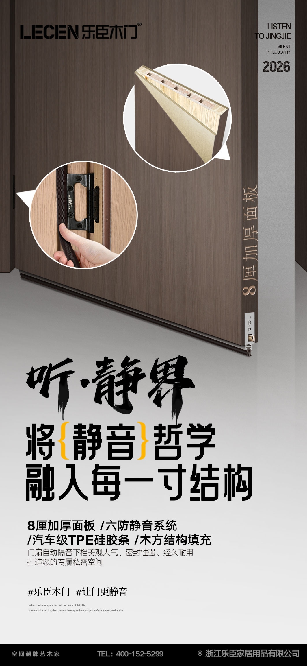 【视.无界】以匠心守初心!细节见真章,每一樘门都有乐臣魂。 【听.静界】将静音哲学融入每一寸结构,乐臣让门更静音。 【愈.呼吸】我们对健康的承诺,深藏于每一次呼吸。 乐臣木门从视、听、触、嗅出发,用五感定义一扇好门,只为给你一个完整的、关于家的美好想象。 乐臣木门,懂门,更懂你想要的生活! 跟随乐臣,让我“门”告别平庸,与众不同!