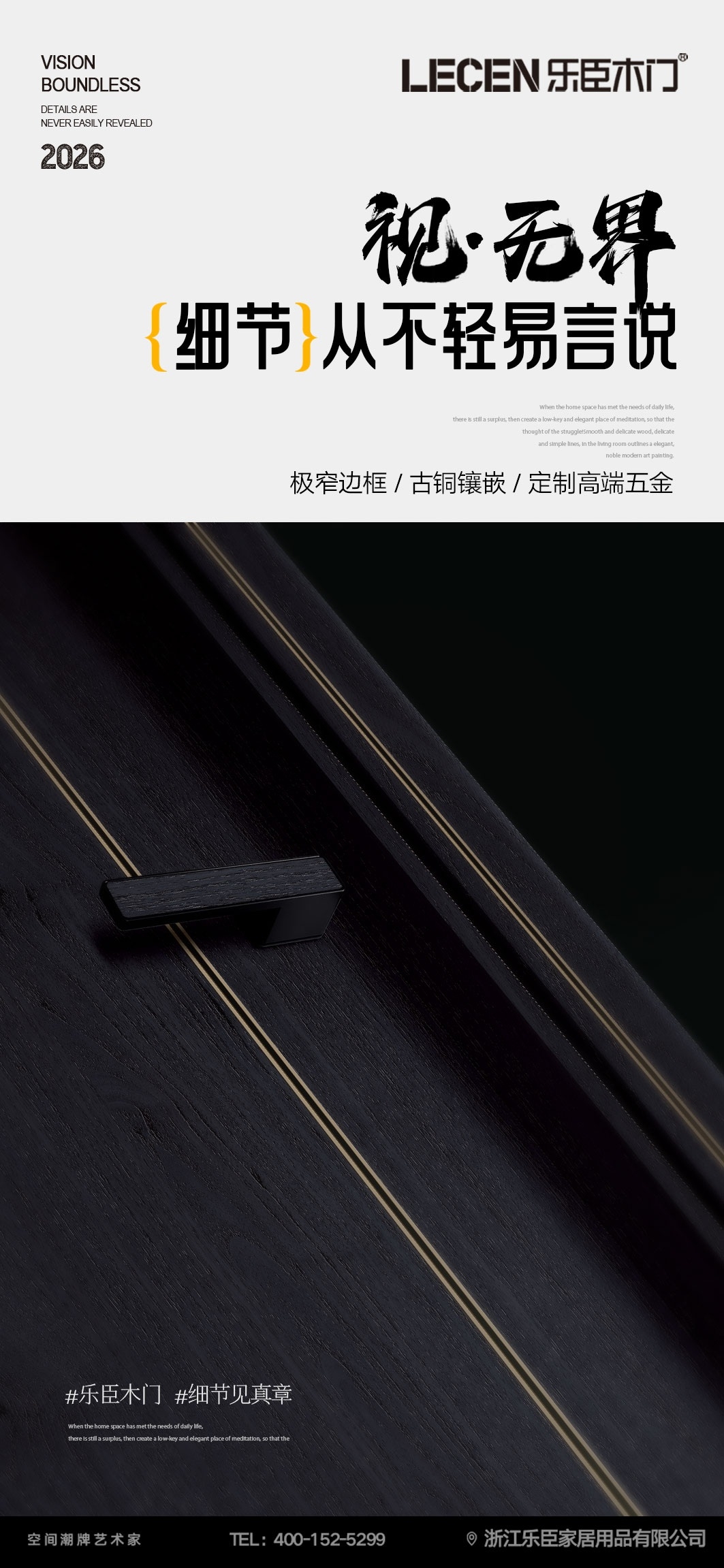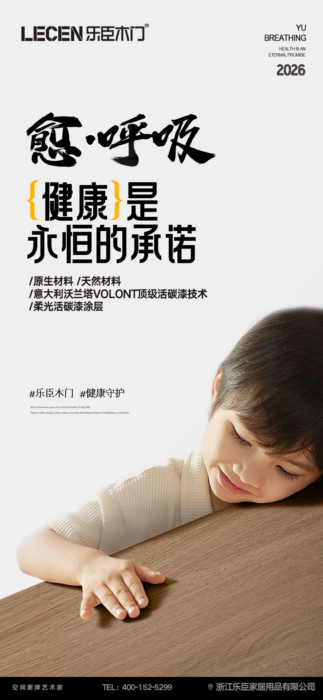 【视.无界】以匠心守初心!细节见真章,每一樘门都有乐臣魂。 【听.静界】将静音哲学融入每一寸结构,乐臣让门更静音。 【愈.呼吸】我们对健康的承诺,深藏于每一次呼吸。 乐臣木门从视、听、触、嗅出发,用五感定义一扇好门,只为给你一个完整的、关于家的美好想象。 乐臣木门,懂门,更懂你想要的生活! 跟随乐臣,让我“门”告别平庸,与众不同!